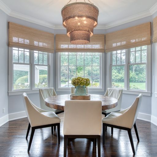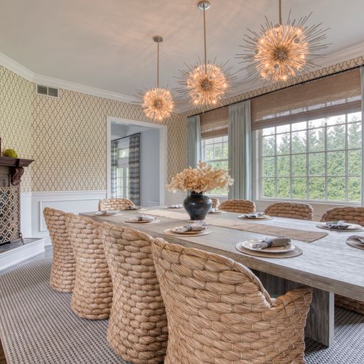 The open atrium-style entrance foyer sets the tone for this light-filled house, thanks to oversized transoms in the windows that maximize the light throughout the three stories. The first floor features multiple open-plan spaces that contribute to the sense of airiness. At about 420 square feet, the formal great room offers ample space for entertaining, while a 225-square-foot family room adjacent to the kitchen is a more intimate and leisurely space. Warm-toned oak flooring throughout gives the house a finessed country feel and complements the other fine finishes and trim.