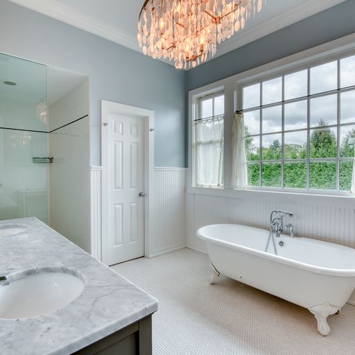 At the heart of the large eat-in kitchen is a custom-made island that serves as both a work space and a spot for casual dining or morning coffee—or a glass of wine from the integrated beverage fridge. Other top-brand appliances include a Wolf six-burner range, Sub-Zero refrigerator and dual Miele dishwashers. The two half baths are on the main floor, one conveniently near the mudroom.