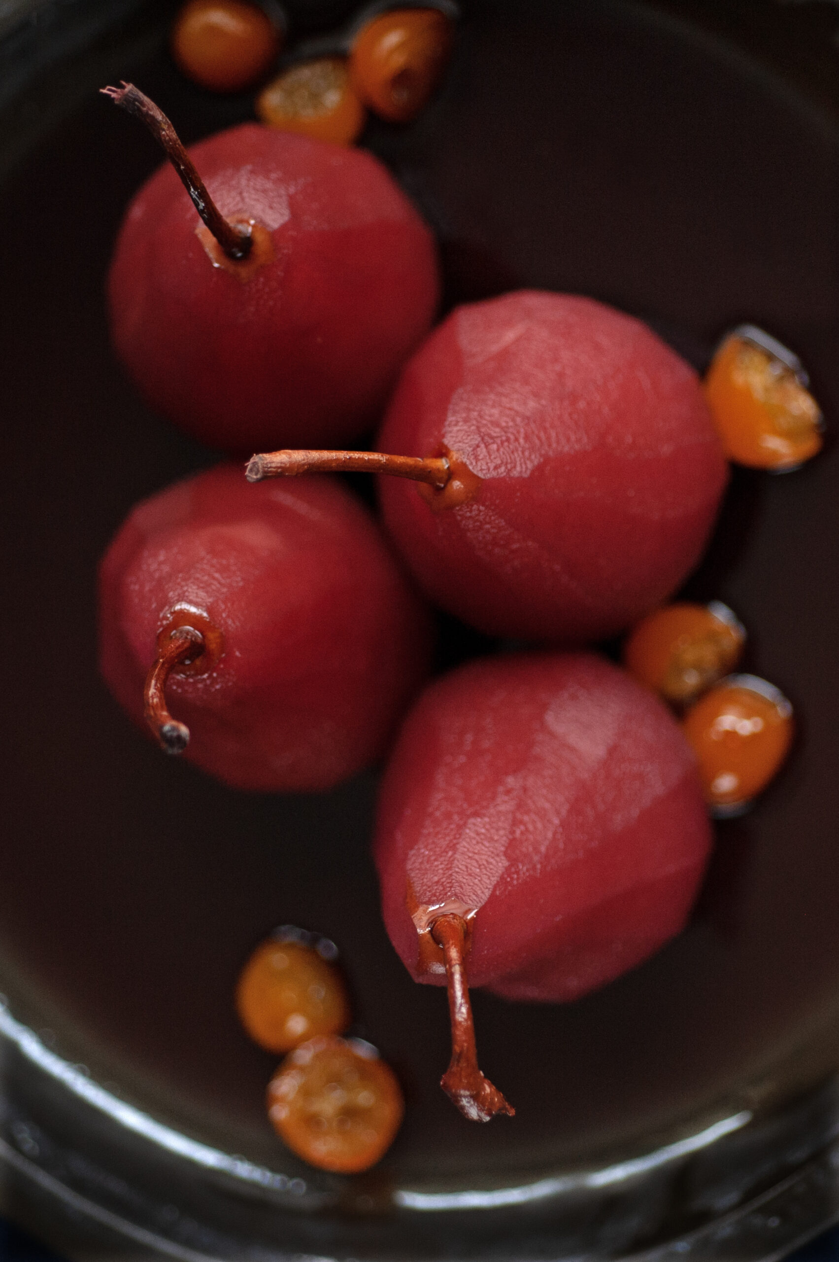 Cutting the bottoms of the pears flat will help them stand more easily in the final step and for dramatic plating. Be sure to bring the pears to room temperature before serving then drizzle the reduced syrup over them. Certainly, vanilla ice cream or crème fraiche can accompany these beauties, or if you’re feeling extra ambitious, try scattering some candied kumquats around the dish in the syrup. (Add them in while reducing the poaching liquid; 10 minutes should do it; then remove with a straining ladle.) Simplicity is also an eye-catching option, serving them as-is on a dark, ceramic platter.