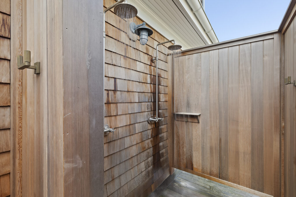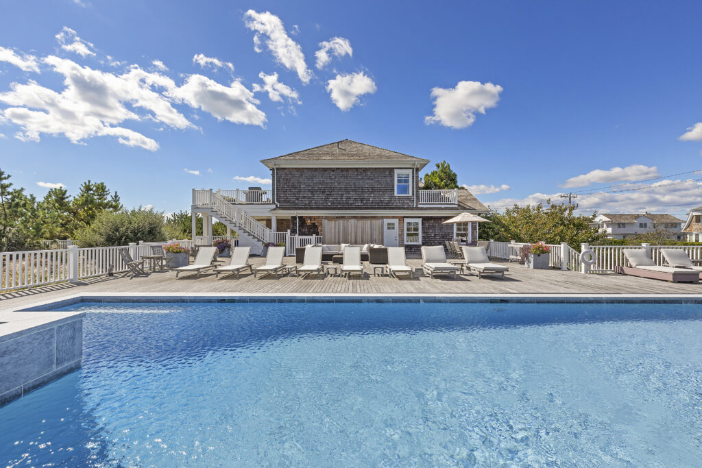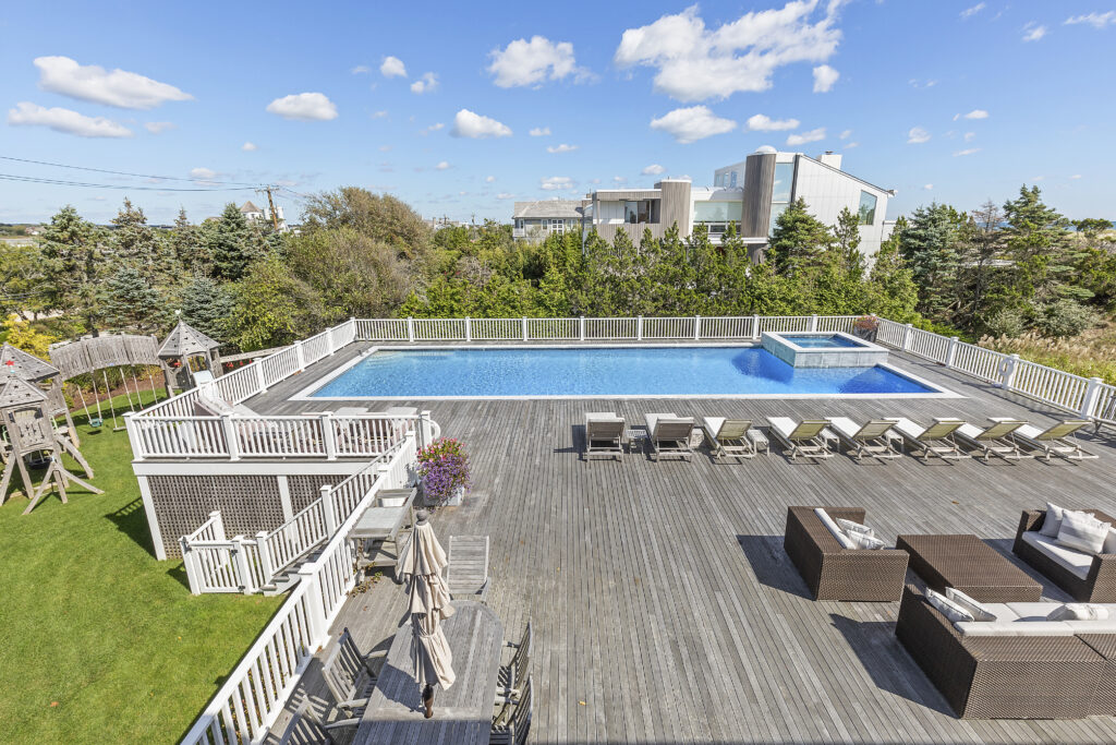 Sited on a double lot of 1.94 acres—“unheard of between the two bridges on Dune Road,” Farrell says—the house features a generous front yard with mature leafy trees offering privacy around the lot. The wooden kids’ playset was also refurbished in 2021. The 20 x 60 gunite heated swimming pool/waterfall spa is encased in a wooden deck that offers ample lounging and dining areas, as well as a large outdoor shower and changing room. Two additional upper and lower decks respectively offer 5,000 and 1,000 additional feet of space.