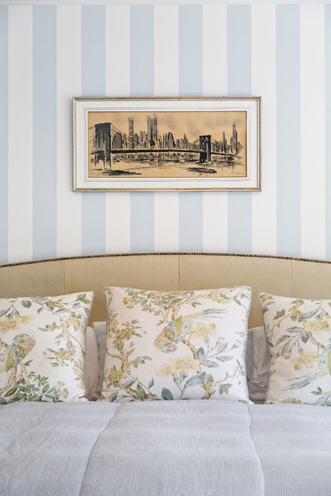 The updated 690-square-foot kitchen offers two eat-in options—at the center island and at the counter, seating four and five respectively. The appliances include a six-burner Viking range with a double oven, two Sub-Zero refrigerators and a wine cave, and full- and half-size dishwashers. A porcelain farm sink complements the cottage-style custom cabinetry and hardware. Adjacent to the kitchen is a 385-square foot junior ensuite bedroom with its own balcony. The common areas can access a hallway a powder room with a double sink vanity.