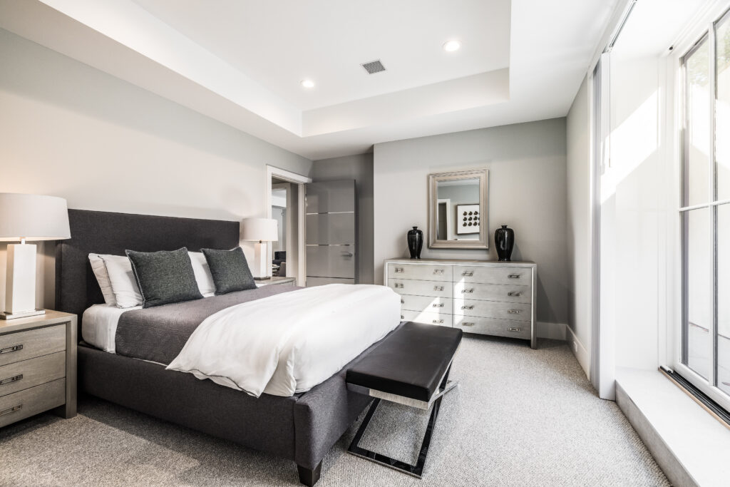A wall of floor-to-ceiling window and doors light up the lower level, which is accessed from the interior floating staircase, but also via an exterior entryway. The finished portions include a 525-square-foot home theater/recreation room, two bedrooms of almost equal size (195 square feet), which share a bathroom and a laundry room with double washer/dryers.