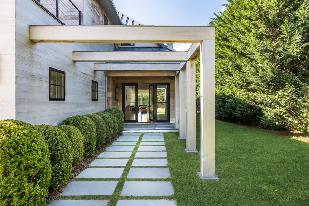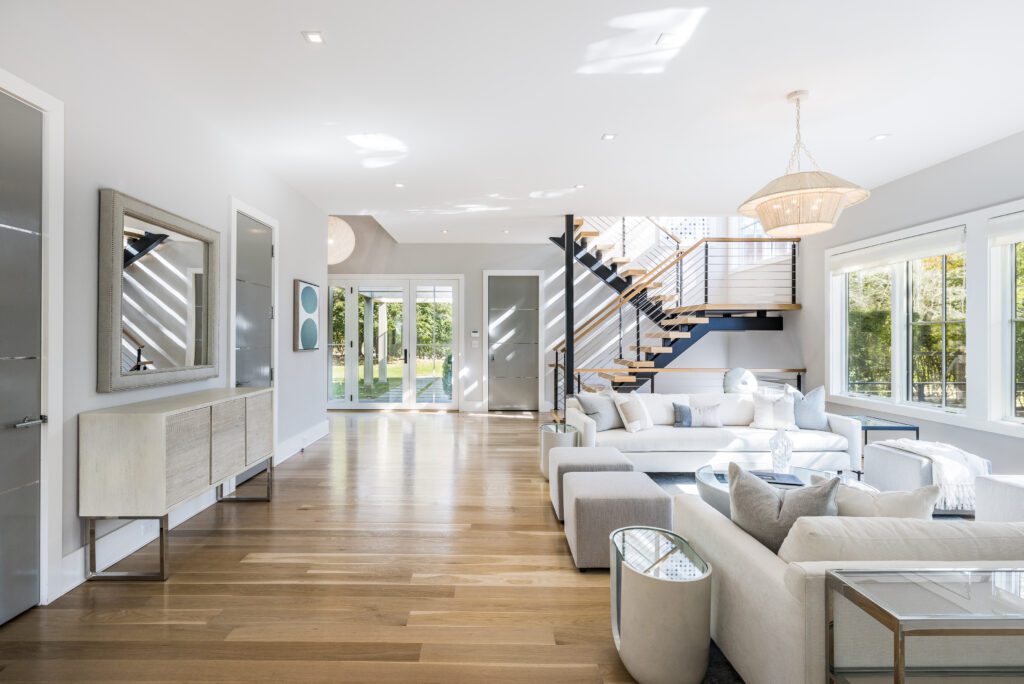 Calling it “a little house that packs a big punch and checks every box,” the 4,259-square-foot home is entered via a bluestone-paved path and under an open modern pergola. A floating staircase is the main architectural feature of the generous foyer that leads into a 490-square-foot open living and dining room that, in turn, leads into a combined kitchen and great room of nearly 720 square feet with a wood-burning fireplace. Large-paned sliding doors lead to the patio. A half bath is adjacent to the space. White oak hardwood floors provide visual continuity through the house.