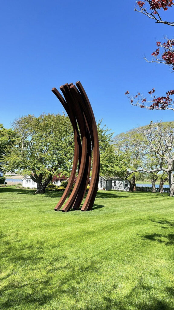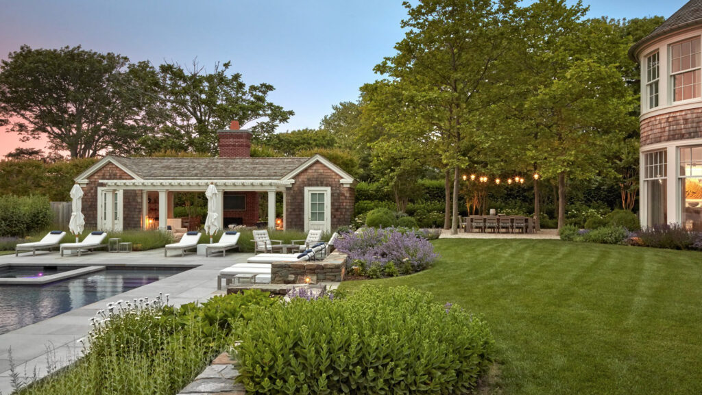 You’ll feel like you’ve been transported to an English summer garden when you amble down the stone path of this storybook garden rimming Georgica Pond. A trio of crape myrtle groupings are ever-more stunning accented by the brightly hued plantings of lace cap hydrangea, and the handmade-brick wall dividing the crab apple allée from the private pool area brings the past and present together (and will feel a little like The Secret Garden come to life). Designed by Harmonia Inc., be sure to wander over to the French conceptual artist Bernar Venet-commissioned sculpture, “97.5° Arc x 9,” its height and power vying with that of the mature trees on this lovely landscape.