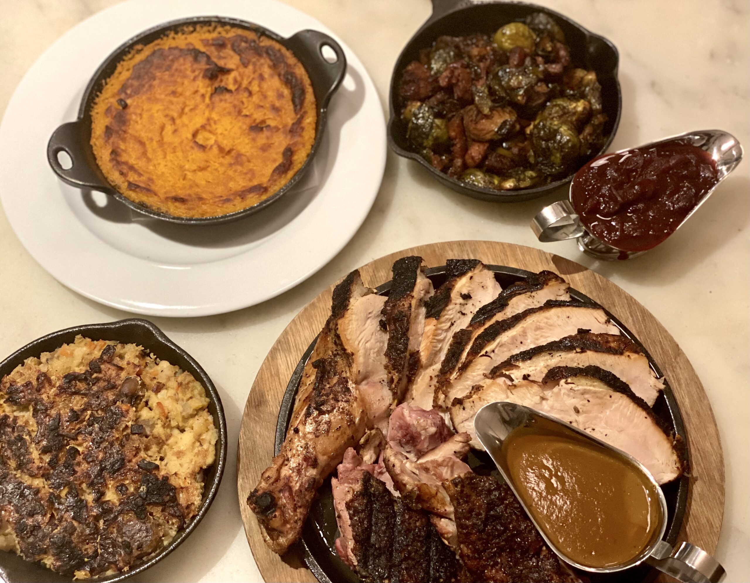 Forego clean-up duties and turn Thanksgiving into an intimate two-person affair at this popular Sag Harbor Mediterranean restaurant known for its lively open kitchen that centers around a wood-fired oven serving next-level pizzas. On Thanksgiving, the turkey gets to take center stage. The sit-down dinner-for-two option includes the obligatory bird plus sides like cranberry sauce, stuffing and roasted lemon-Brussels sprouts. Can’t imagine Turkey Day anywhere other than your traditional spot? A takeout package serves two to four and includes a house salad, fresh-baked baguette, roasted turkey and fixings. Additional sides and proteins like lobster, duck and a mini grilled cheese can put a welcome twist on traditional Thanksgiving feasts. An apple tarte tatin caramelized to perfection is your dessert.