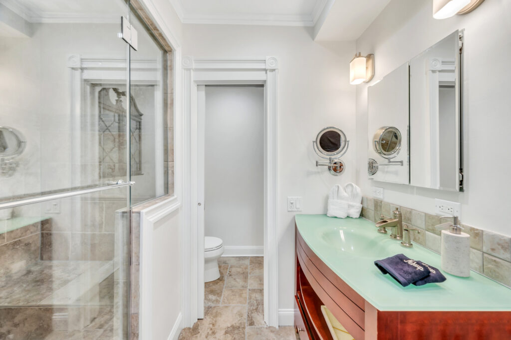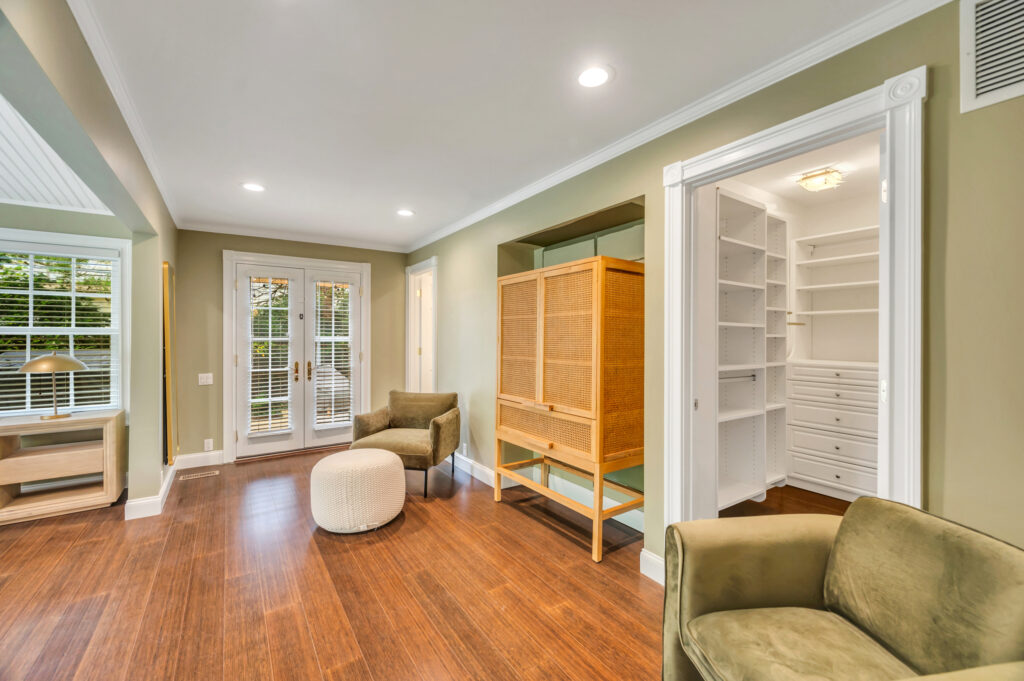 The other prevailing feature of the first floor is a large primary ensuite bedroom of two adjoining rooms, one for sleeping and the other used as a sitting area, totaling nearly 310 square feet. The suite is completed by three closets—one of which is a large walk in—and its own 242-square-foot deck.