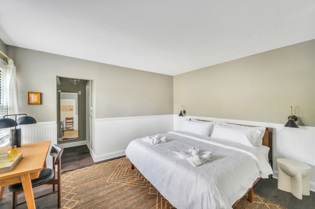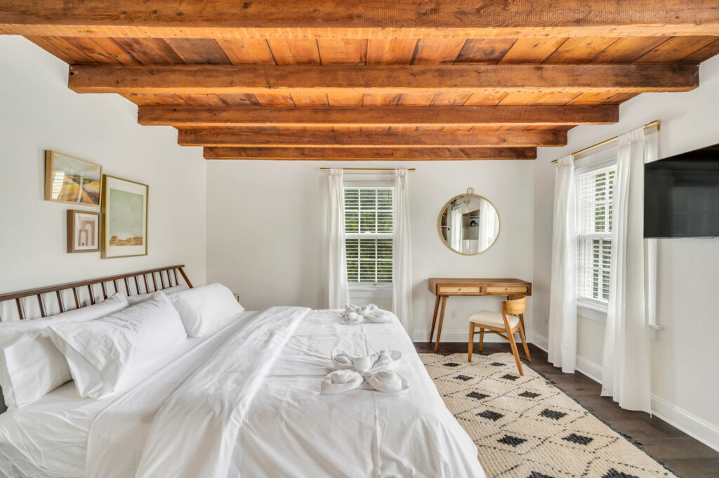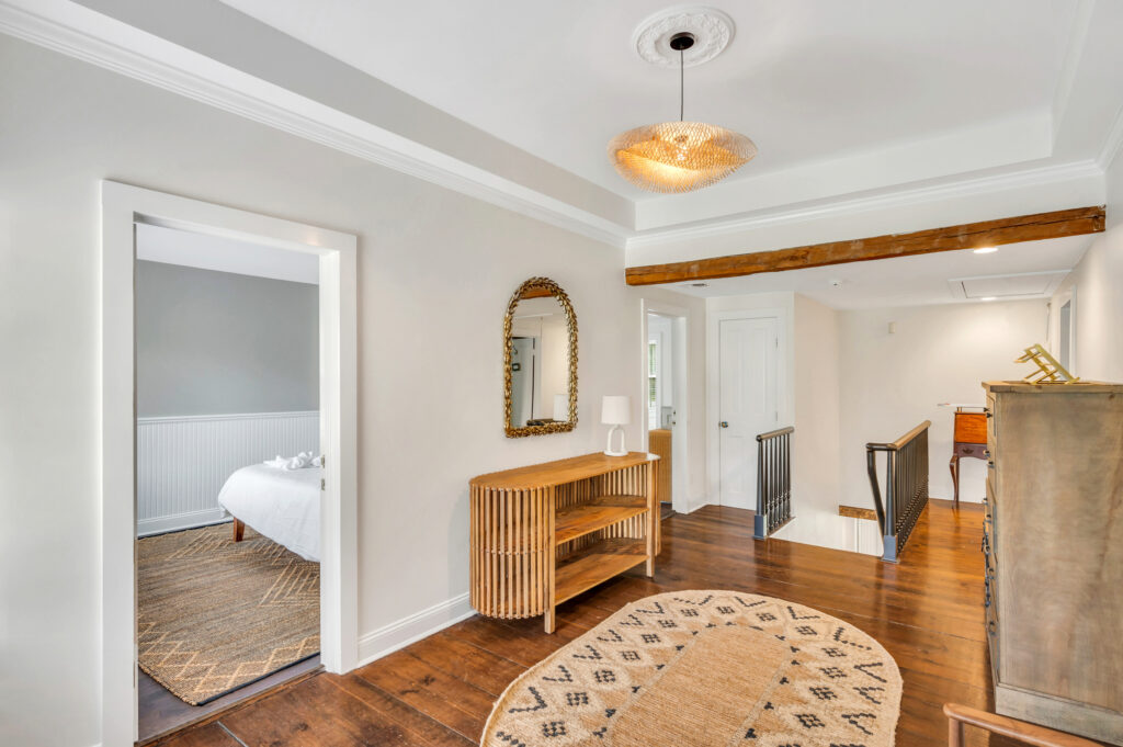 The second floor is devoted to five ensuite bedrooms around the center hallway, ranging in size from 127 to 265 square feet. One of the rooms features the original wooden wall-to-wall beams, typical of those found in century-plus-old homes. Access to the attic is via a pull down ladder, but with seven-foot ceilings, Fedner says adding a staircase enhances the potential to reimagine the space.