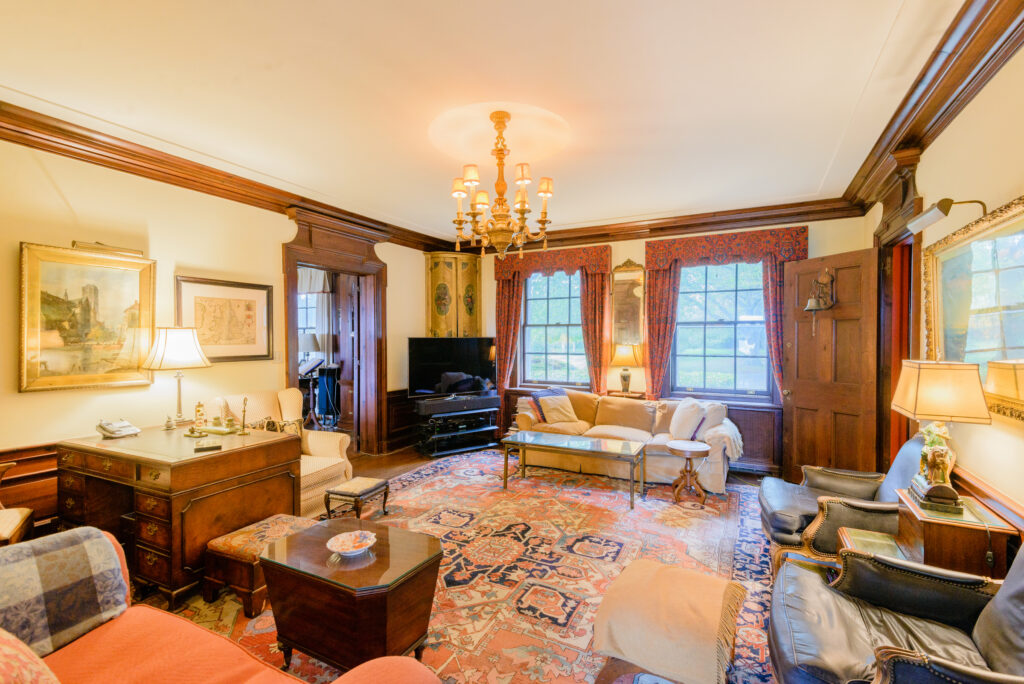 With 7,900 square feet over two levels, the house ensures even the largest family will have plenty of room to roam. The first floor is classically laid out with most of the space devoted to large common areas—a 583-square-foot living room, 304-square -library with a wet bar and built-in bookshelves, 428-square-foot dining room and a 387-square-foot window-lined sunroom/gallery overlooking the back yard. The living room is paneled, floor to ceiling in walnut with Grinling Gibbons carvings over doors and mantel, and featuring arched built-in bookcases. All wood-burning fireplaces are working. There’s egress to an oval-shaped outdoor loggia.