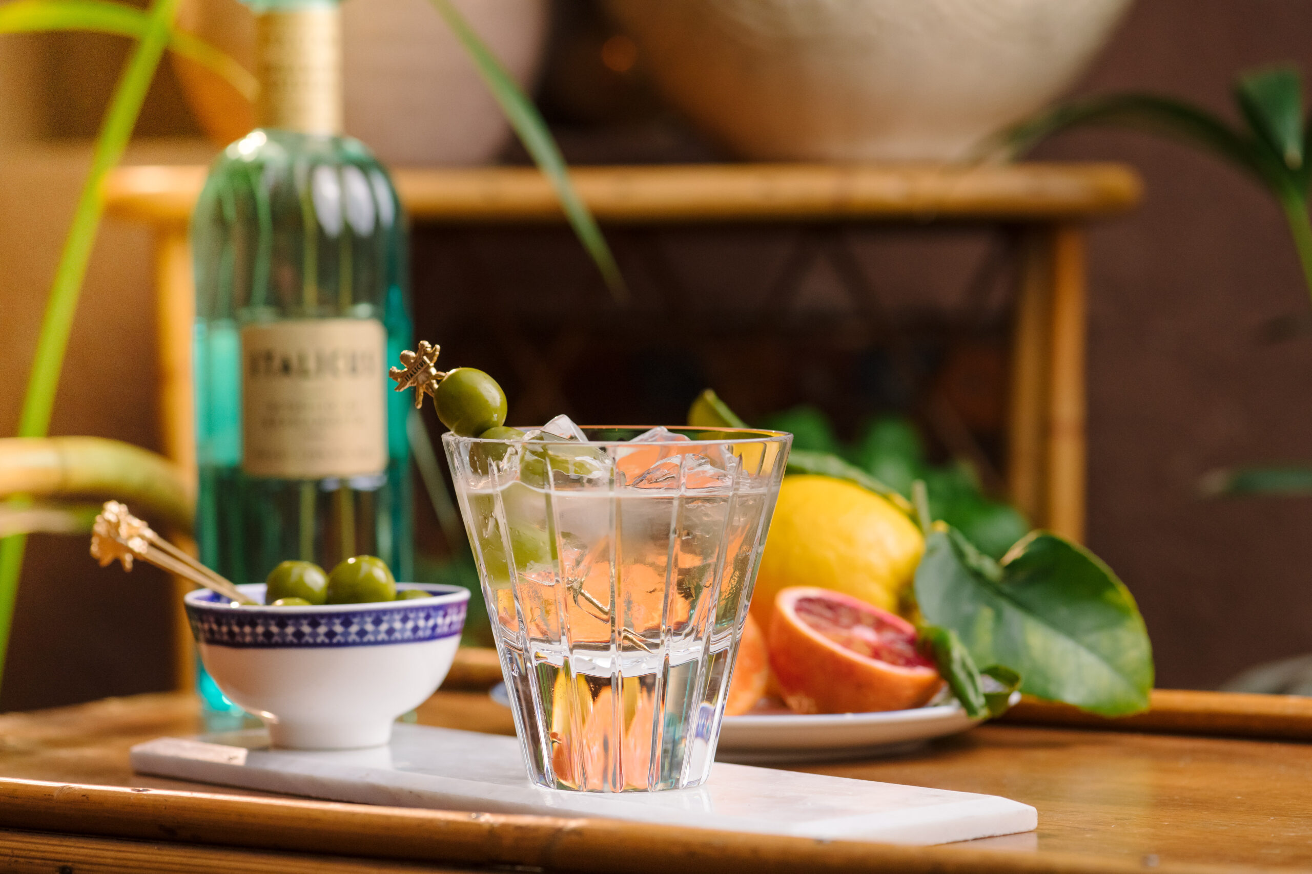 - Stir well. Garnish with the pink grapefruit wedge or a trio of skewered olives. Cheers!