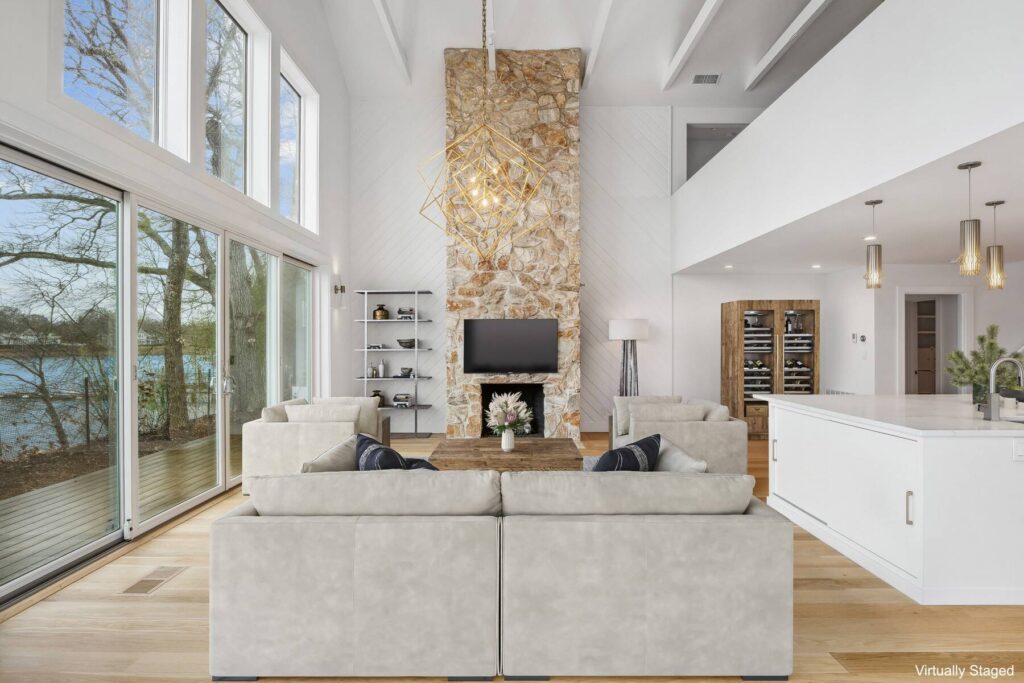 The first floor features an open format living/dining room and kitchen with soaring ceilings and sliding doors to the deck and oversized stacked windows above creating a wall of glass overlooking the water. The centerpiece of the living room is a double-height, floor-to ceiling stone chimney with a gas-fueled fireplace. A large L-shaped island separates the living room from the kitchen and provided ample storage and a prep sink. Like the counters, it is topped with white quartz.