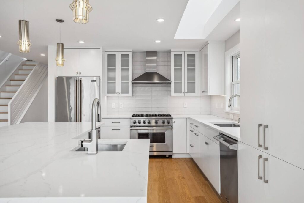 The owners kept the kitchen simple and sleek, in harmony with the contemporary lines of the home. Extra-long white subway tiles back the custom cabinetry, which has brushed chrome hardware to complement the Viking stainless steel appliances. The upper cabinets are both closed and glass-paned. Hardwood floors give warmth to the rooms throughout.
