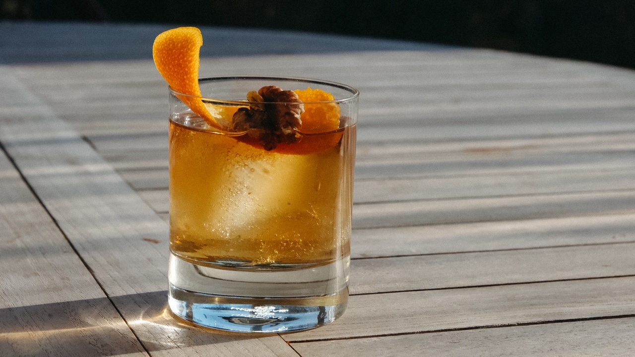 - Garnish with the orange peel and walnut. Cheers!