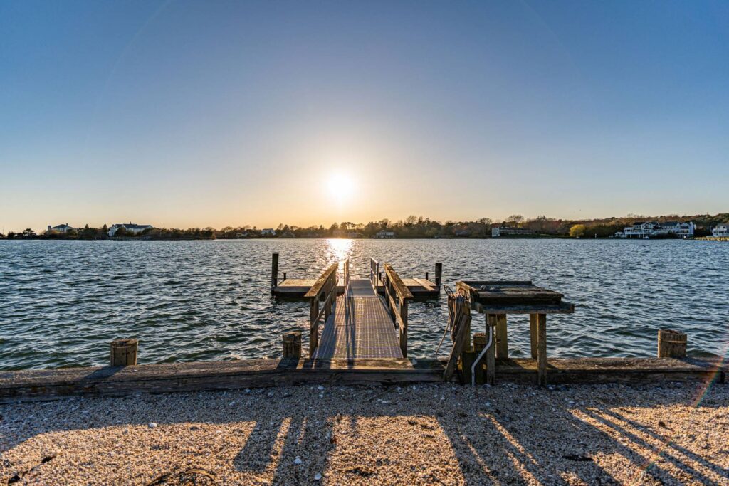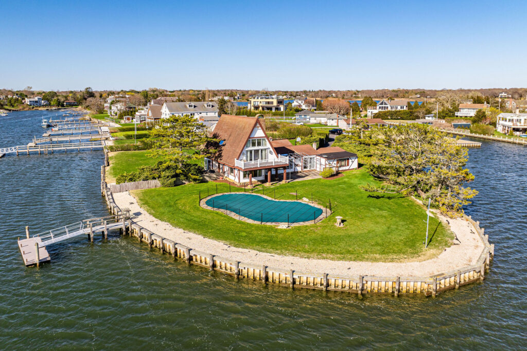 At the end of the peninsula with water surrounding three sides of the lot, the home is surrounded by sky and water and offers unobstructed spectacular sunset views toward Shinnecock Bay.