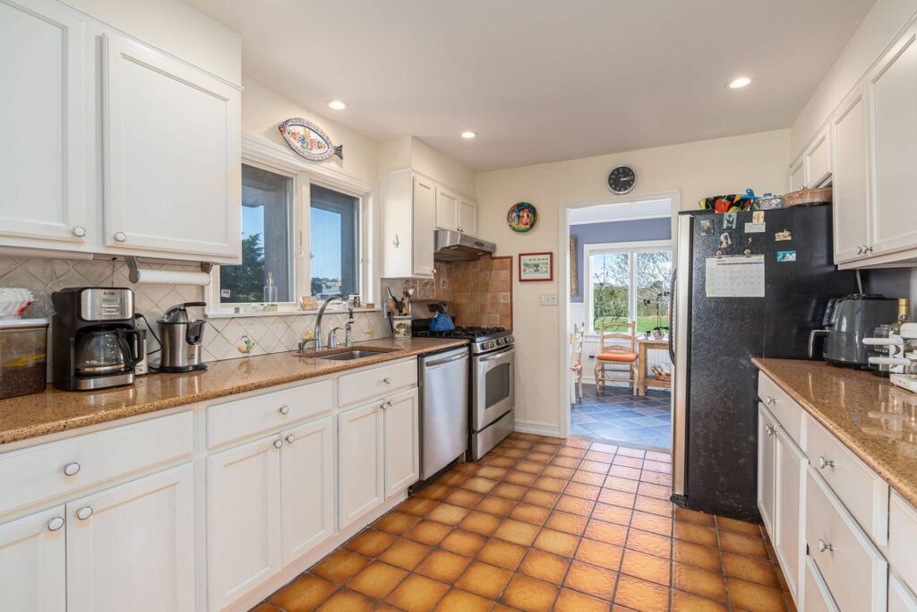 The kitchen’s original wooden cabinetry is in place and in excellent condition, topped by granite counters. The stainless-steel appliances include a dishwasher; a double sliding window over the sink is one of many with a water view.