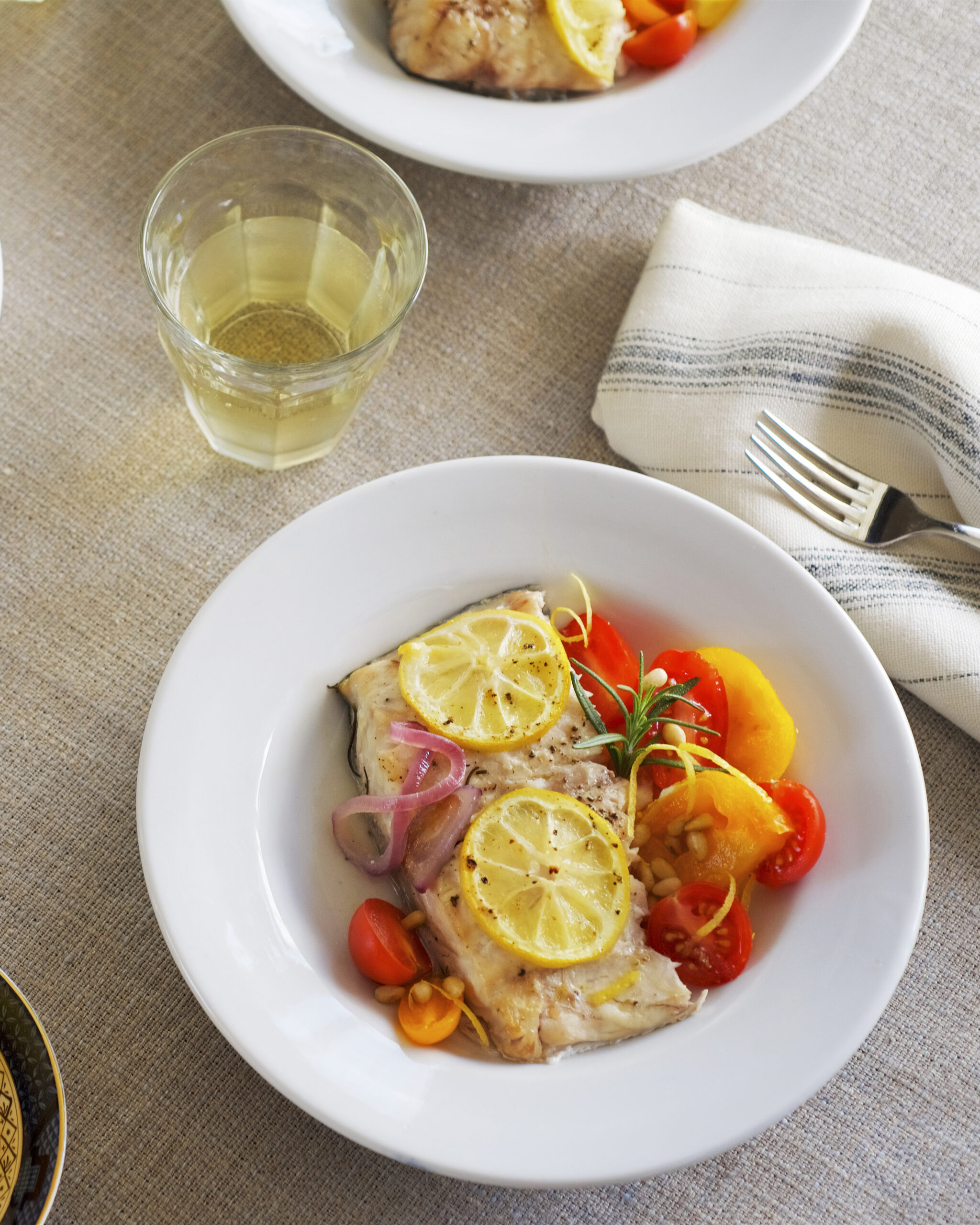 Well known for its meaty, firm texture, striped bass offers varied culinary options and can withstand grilling and roasting, as in this recipe. Roasting the fish with fresh herbs, lemon and onion keeps the flavor focused on the fish, which is so fatty that it will taste buttery on its own and needs little more than salt and pepper for seasoning. One thing most cooks implore, as does Falco: Don’t to overcook the fish! Make sure the flesh remains opaque.
