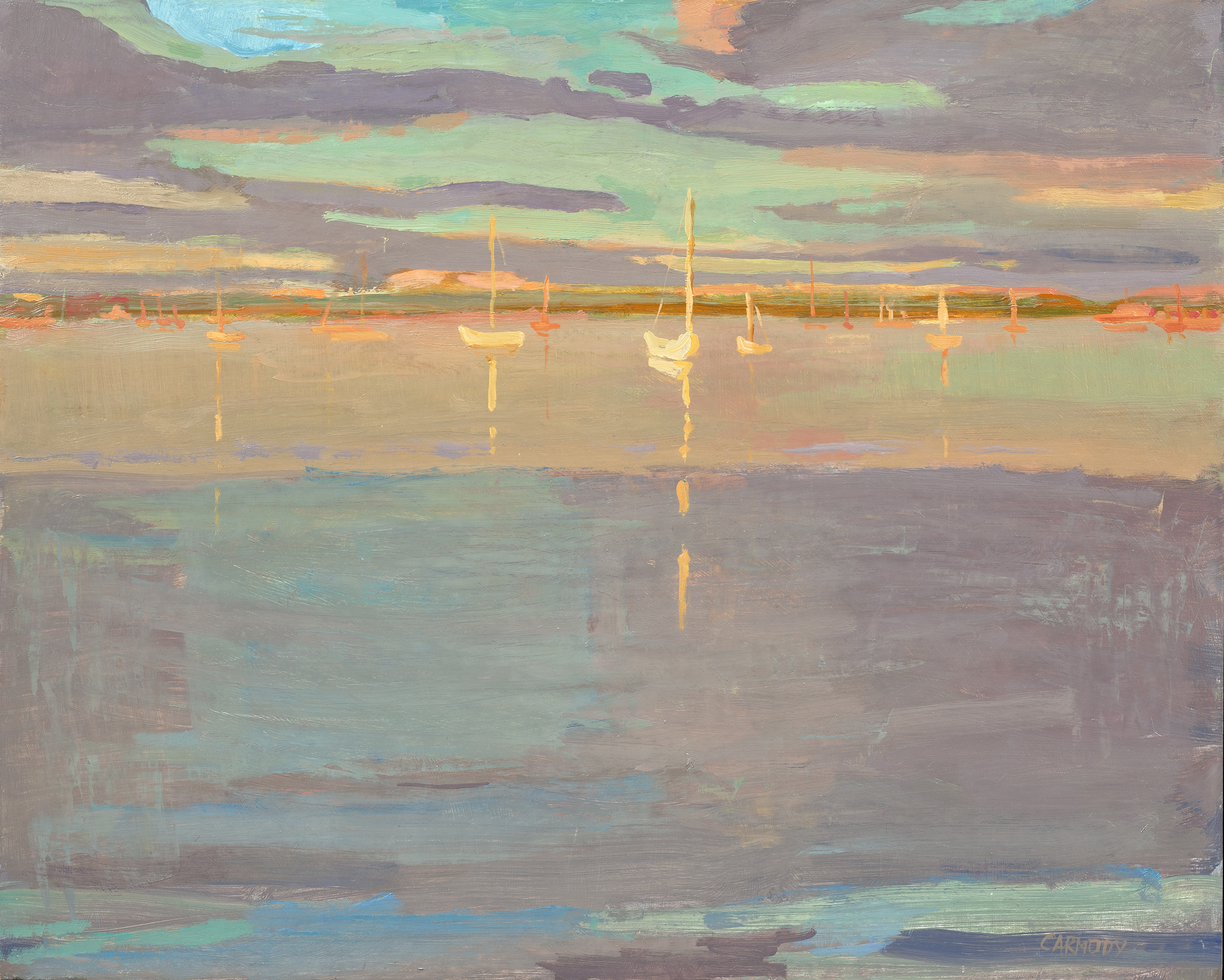 “I’ve been going to Shelter Island for about seven years now,” Carmody says, “for shorter trips, but this time I was able to really focus and really, albeit slowly, investigate the light and the water. More often than not I was the only person there,” she says of her plein-air painting sessions, “but this time I got to feel like I was connected to the community.”