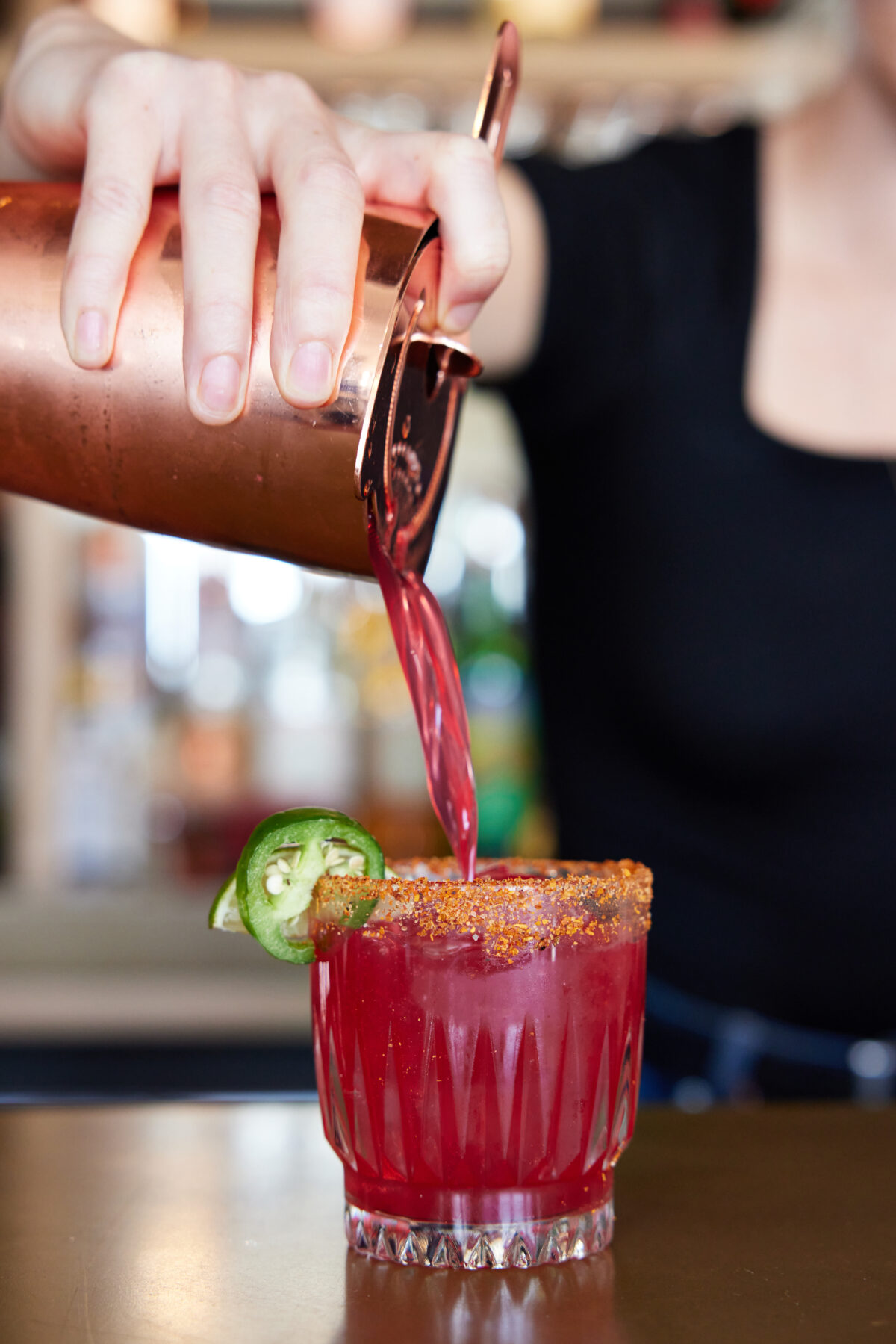The on-point cocktails and super chill vibe don’t hurt, like this thoughtful makeover of the classic margarita. Making the hibiscus tequila used here is simple enough — it just takes patience. Use a full 750ml bottle of silver 100% blue agave tequila and pour over 1/3 cup of dried hibiscus petals. Store in a dry, cool place for a week and strain over a fine mesh sieve (discard the hibiscus petals), funnel back into its original bottle and store indefinitely.