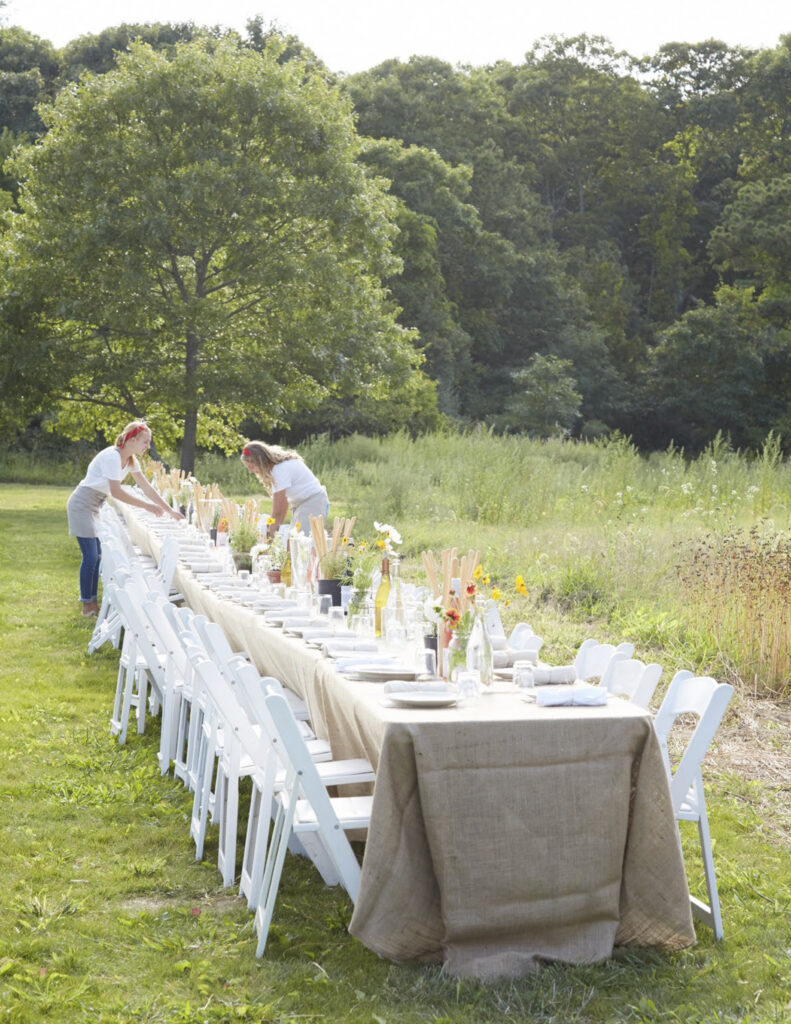“We mowed a path in this field that had gone to seed, and I put ten cafeteria tables down the middle, covered them with a giant roll of burlap, and sprinkled fairy dust on it,” recalls Foley of the simple yet stylish setting she is known for. “Everything was served family style in iron-stone platters and bowls. It was a perfect summer evening.”
