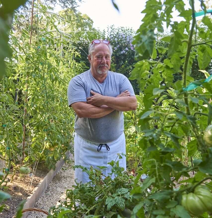 Chef Michael Ayoub in his abundant garden of tomatoes. (Photo credit: Doug Young)