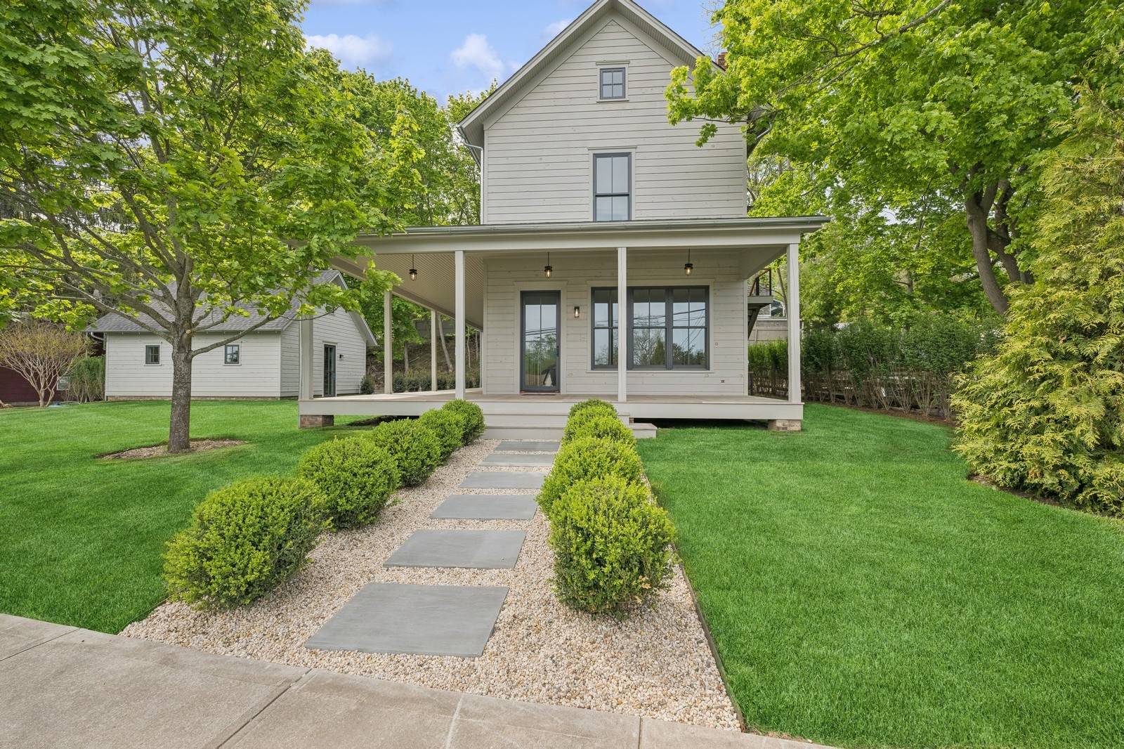 The home is entered through a 625-square-foot covered porch that wraps almost around the house. The first floor consists of a great room, inspired by Scandinavian design, a primary bedroom, full bathroom and a kitchen. The second floor is currently designed with two bedrooms with adjacent full bathrooms, an open-format living and dining area, kitchen and an open mezzanine suitable for storage, a reading nook or a gallery. It has an interior staircase and also a separate exterior staircase entrance/exit. The unfinished, full-height basement houses laundry appliances and plenty of storage.