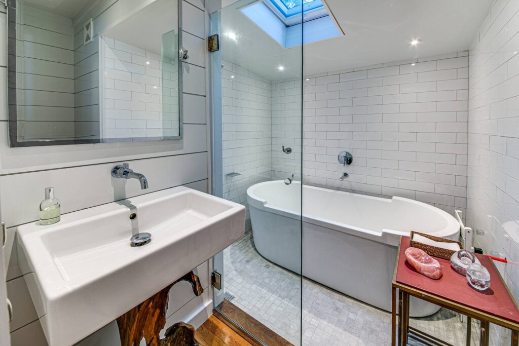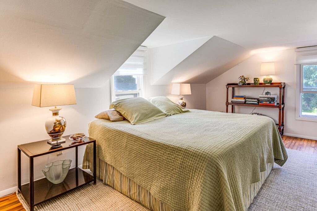 Each bathroom and bedroom has a unique design, making use of alcoves, the sloping roof line, and skylights so that each has its own personality.
