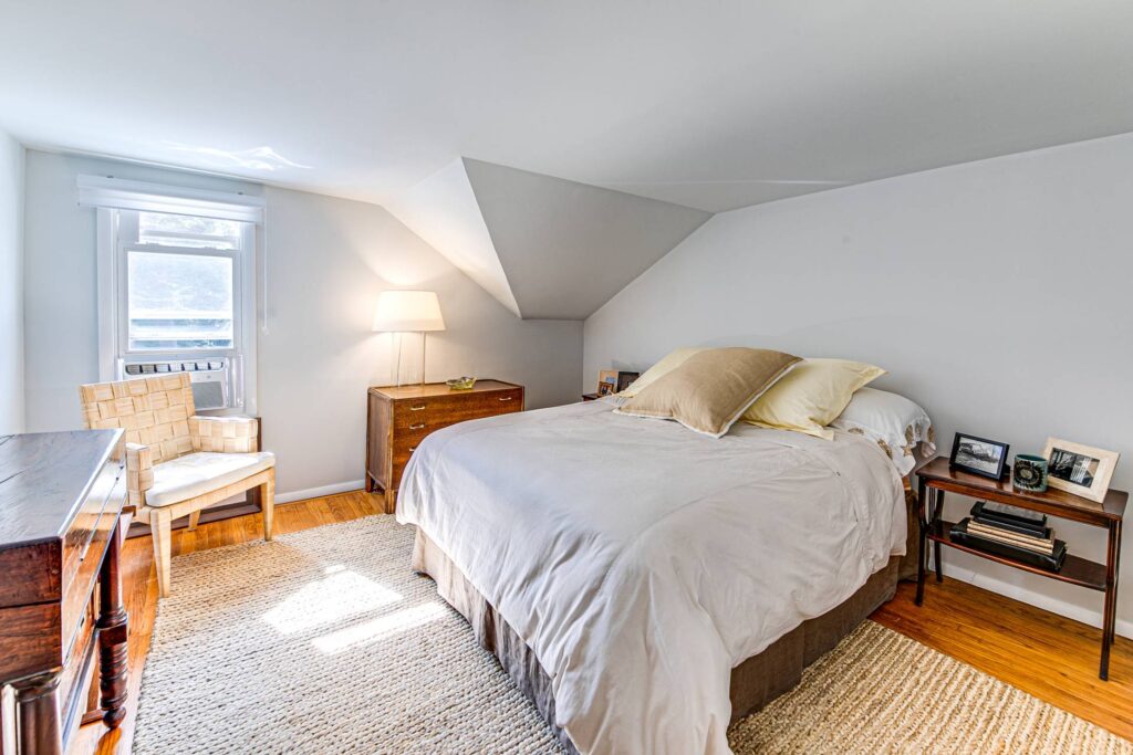 The home was renovated in 2021 by its owners-interior designers, who kept original details such as decorative cornices around the windows and hardwood plank floors. They also respected the interior bones of the house, preserving vaulted ceilings, alcoves and other nooks and crannies typical of a period home, while modernizing it as a comfortable and refined living space.