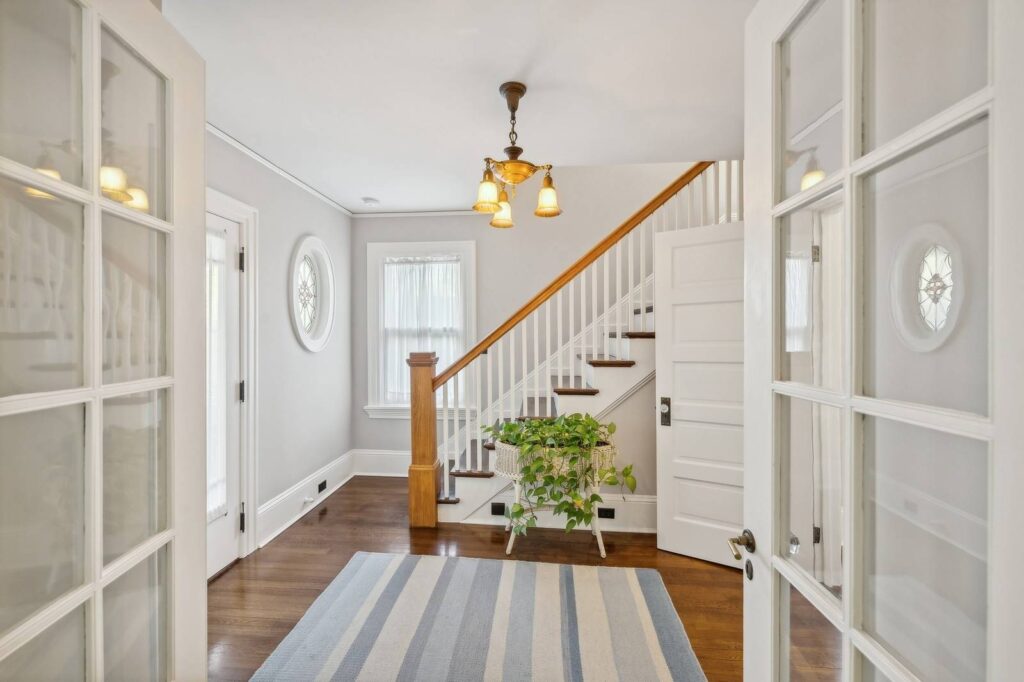 The front of the house features a three-season glass-enclosed porch of 193 square feet. Other details include leaded oval windows, French doors and original wood floors.