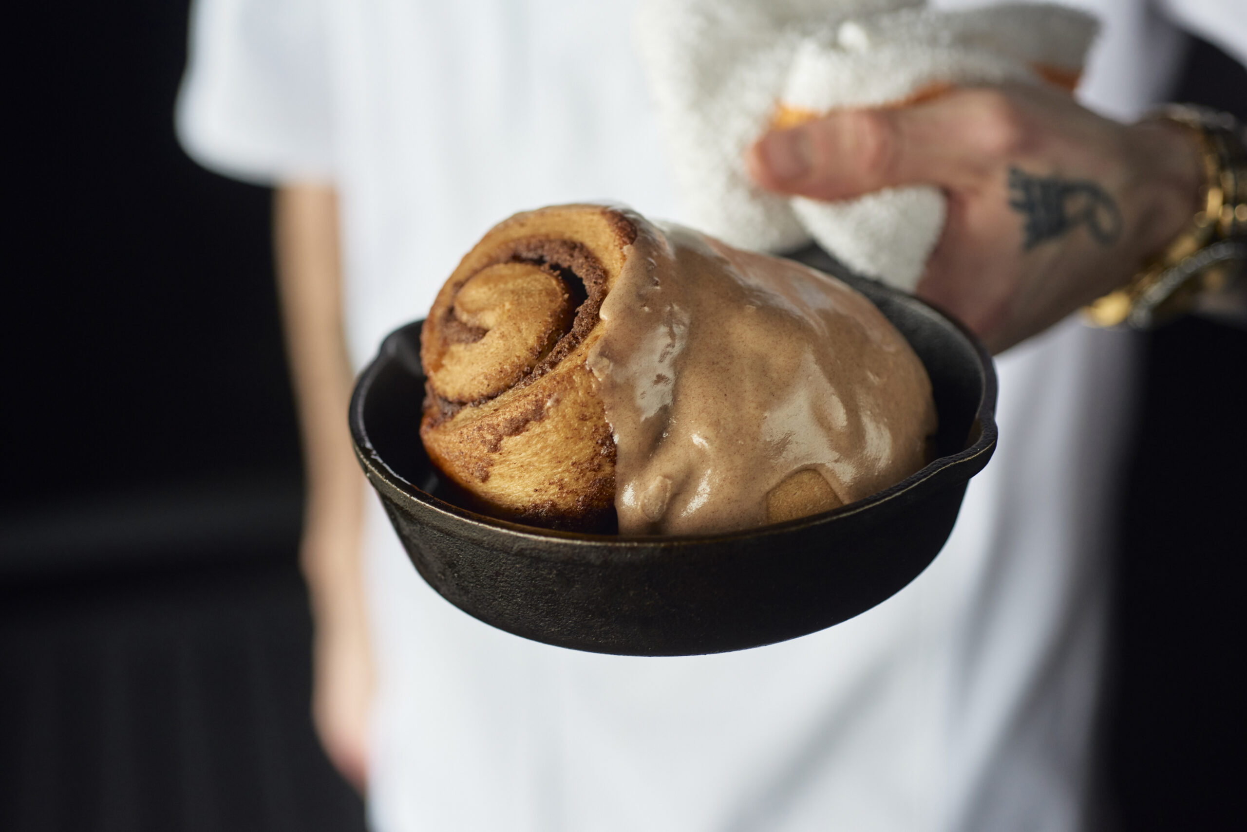 “I thought something a little bit familiar for everybody that’s not so out of the box would be a jumbo cinnamon roll,” recalls the chef, “as long as it was cooked right and tasted delicious.”