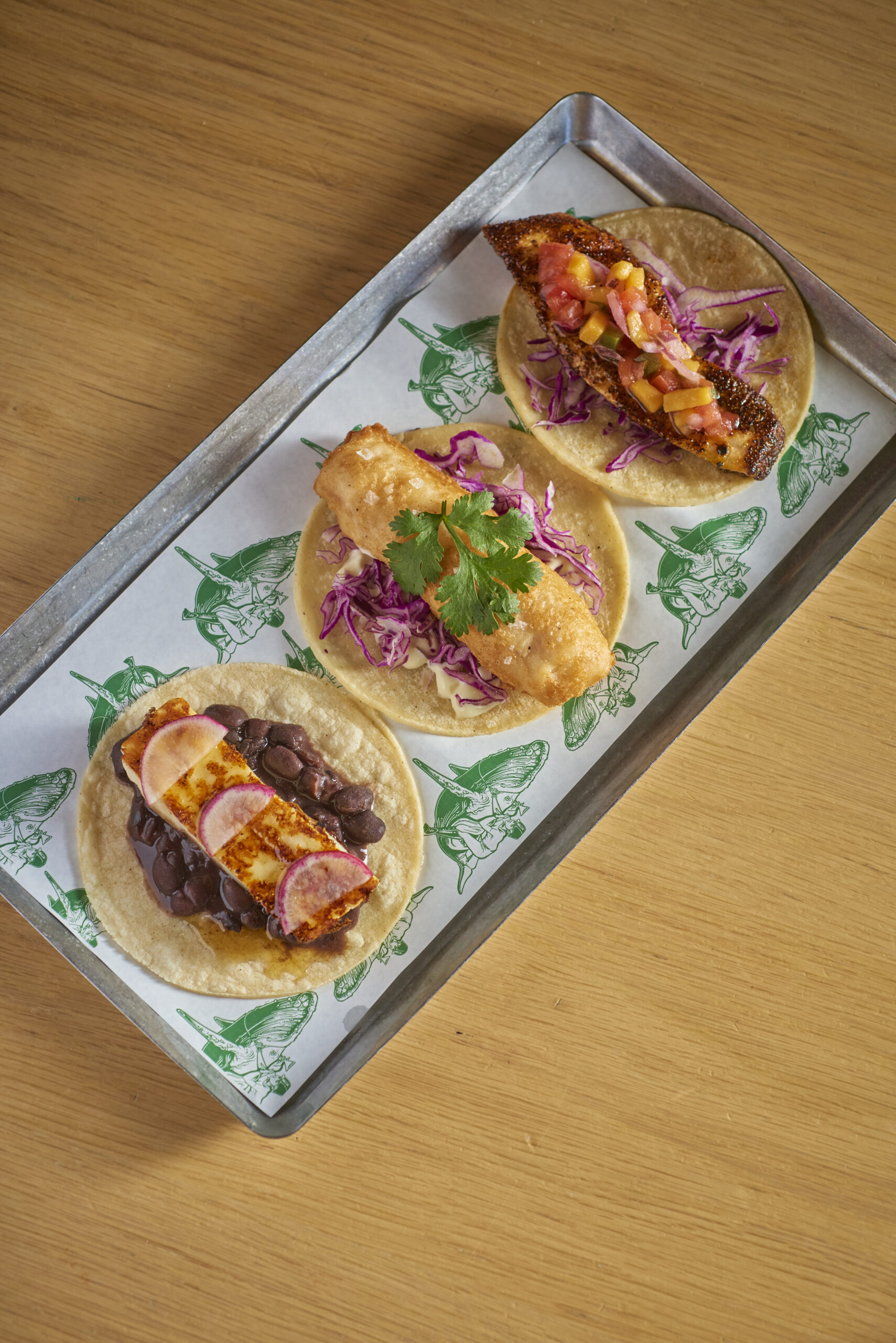 Tacos The handheld versatile menu star comes in eight options, ranging from steak to seafood to vegetarian. Here, we have two ounces of blackened salmon served with mango pico de gallo; tempura-battered hake Baja-style over a lime crema with K Pasa’s own OG hot sauce and raw shredded cabbage; and a piece of seared halloumi atop a bed of coconut-milk braised black beans, bedazzled with julienned radish and a drizzle of hot honey.