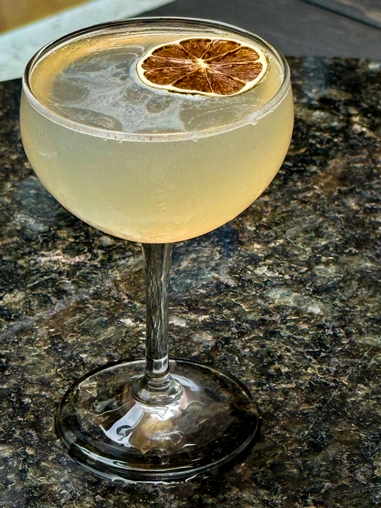 - Strain into a coupe. Garnish with the dehydrated or thinly sliced fresh lime wheel
