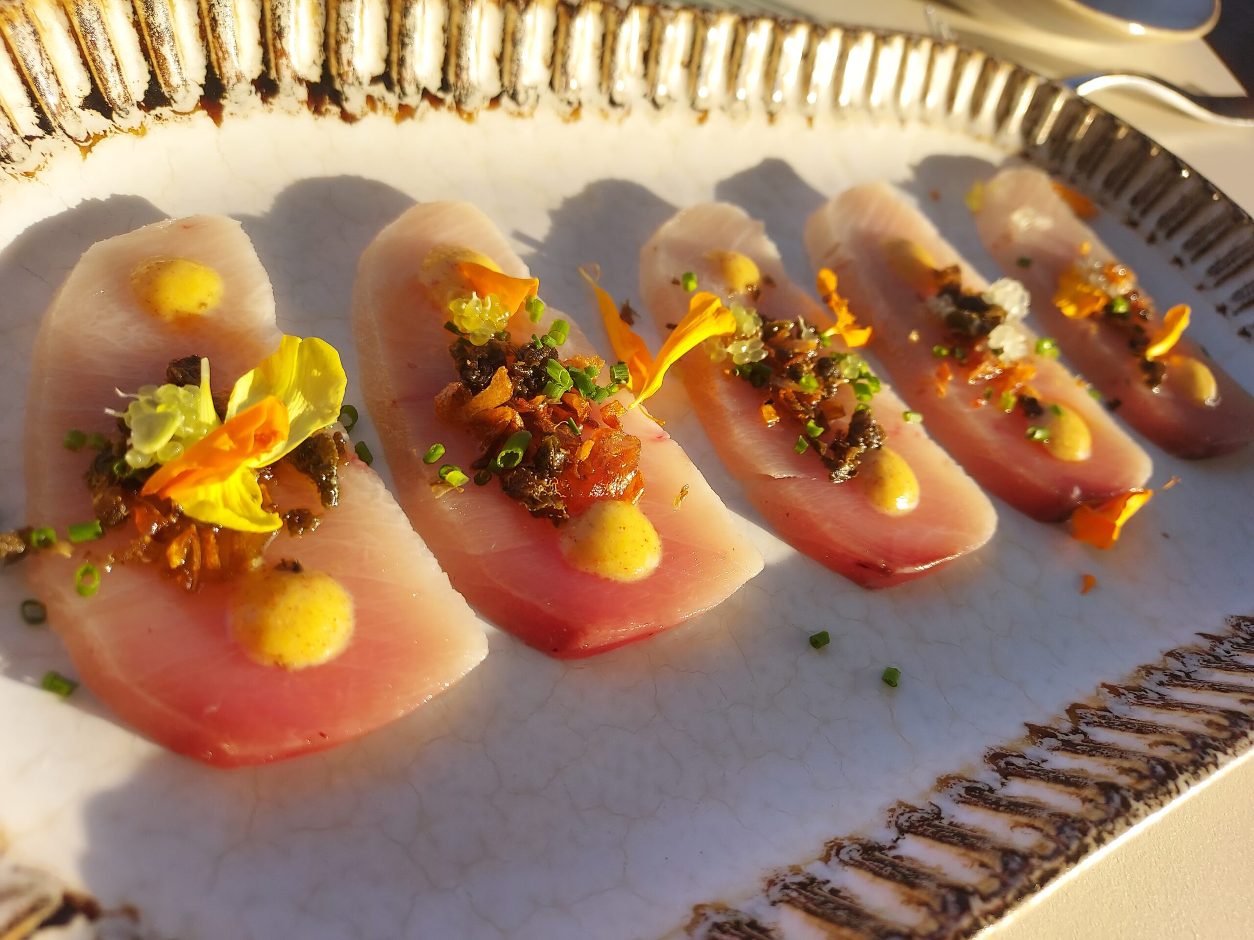 Upon entering Gigi’s guests are greeted by a beachy yet minimal, chic lobby. Just beyond is the host stand. A spacious bar area set with a creamy marbled-topped bar sits to the right of the vast dining room. Clubby, comfy blue chairs with golden accents are set throughout the room. An outdoor patio beckons, anchored by rectangular banquets in the center, while smaller round tables dot the perimeter for the space, framing the 180-degree view of the Atlantic ocean just beyond.