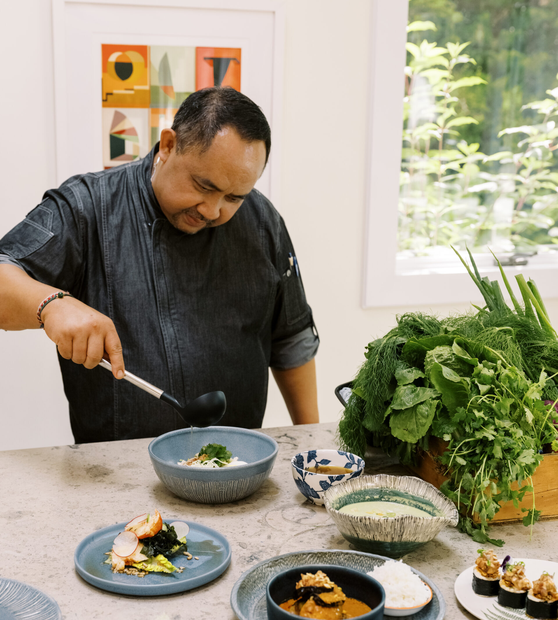 The menu for guests will be season-driven with a healthy focus on nutrition-dense options with twists from Wijaya’s expertise in Balinese and Japanese cuisines and flavors, like a jicama maki roll with fresh local tuna, local sweet corn soup, chicken satay with fragrant lemongrass, as well as morning options like smoothies, avocado toast topped with lettuces, paper-thin radish slices and tomato, and Wijaya’s outstanding housemade kombucha, a far more delicate and nuanced take on the popular fermented drink, in which he uses butterfly pea to infuse a deep lavender hue.