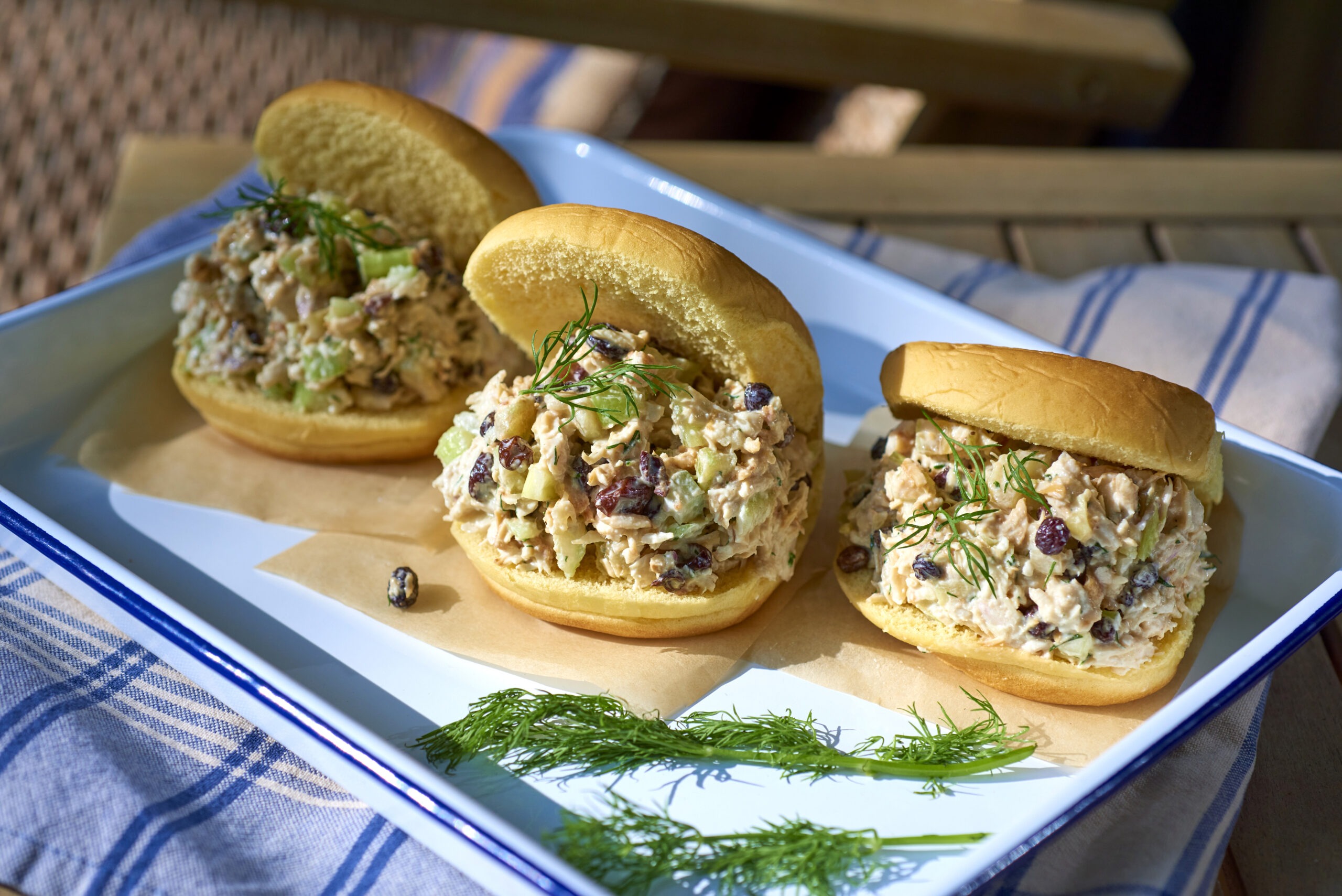 - To serve, spoon a generous portion of the chicken salad onto the bottom half of a potato roll, keeping the top half attached to create a pita-style sandwich.