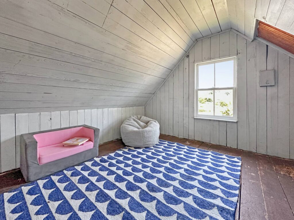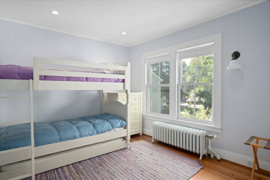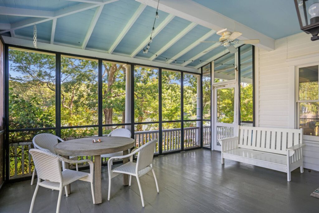 The entry foyer features the original curved staircase and opens to a generously sized—nearly 375 square feet—open format for the living and dining rooms, and on the other side of the hall is a 200-square-foot family room that leads to the kitchen. There is laundry and a full bathroom on this floor accessed through small hallway from the kitchen. The 359-square-foot screened porch “feels like an outdoor summer living room,” Moore says, adding, “In the morning there is a breeze that comes off the water.” Over one side of the house, the second floor is dedicated to three bedrooms that share a full bathroom; the fourth bedroom is over the kitchen. The windowed, finished attic is grandfathered in as a non-sleeping bonus space, used as a playroom.