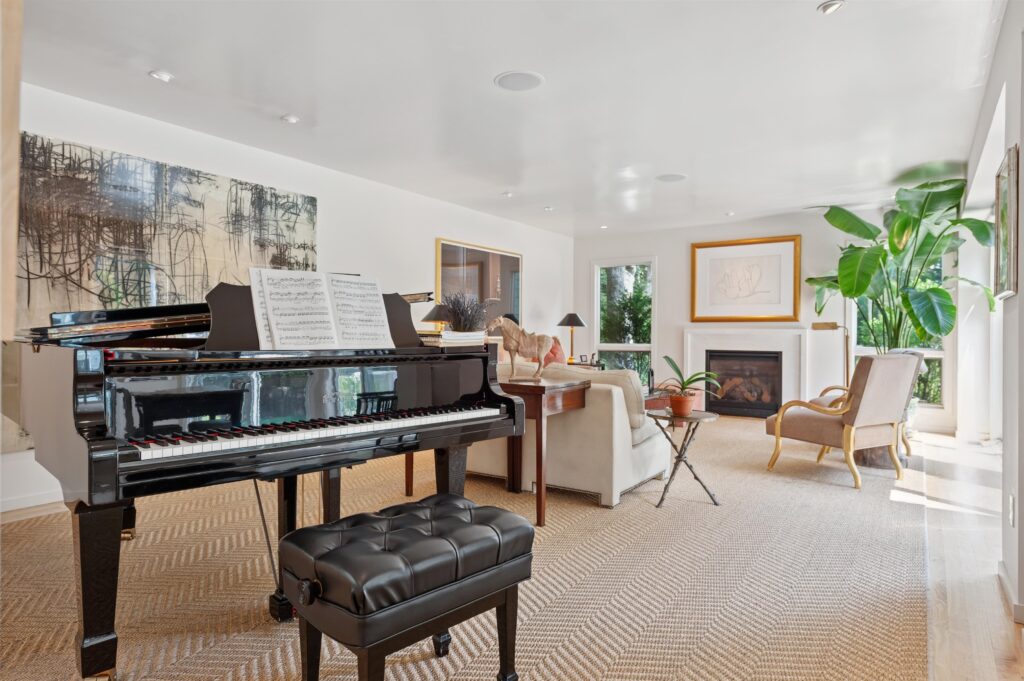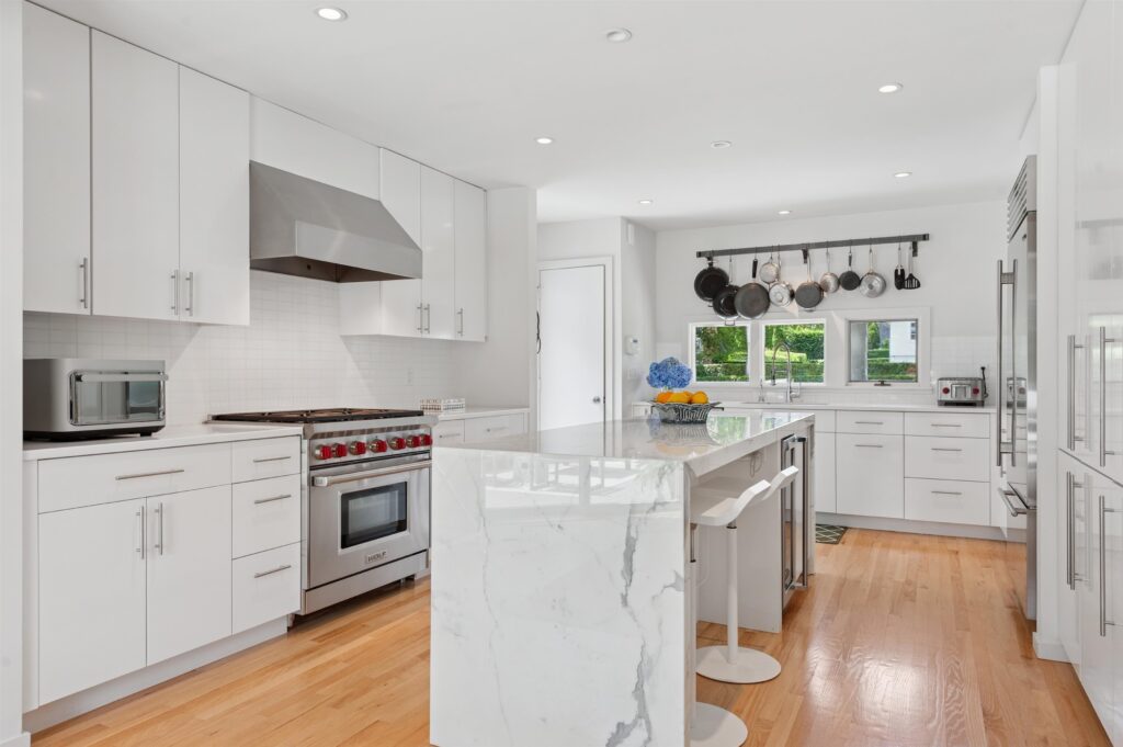The 226-square-foot kitchen has been outfitted with top appliance brands,: Wolf range, Sub-Zero refrigerator, Viking wine fridge and Fisher Paykel dish drawers. Other items are professional grade: ventilation hood, cookware rack and sink with instant hot water. The wall tiles are Italian, individually hand cut so that each is unique, and the mitered custom marble island waterfall features statuario marble from Italy with under-counter seating.