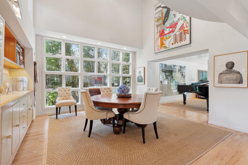 The dining room’s custom sideboard and bookcases were designed Kevin O’Sullivan and feature cerused oak and lambskin covered doors and drawers. A unique design feature of the home is the recurring theme of windows set in uniform grids.