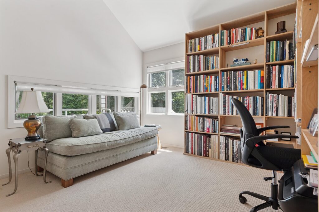 The first floor presents high ceilings and an open layout for the kitchen, the 355-square-foot living and two dining rooms (171 and 224 square feet), with numerous access points to the deck. The upper level is dedicated to the sleeping quarters: a 367-square-foot primary ensuite primary bedroom with double closets and radiant heat floors in the bathroom, and a light-blocking shade system that protects artwork. Two bedrooms, one of which is in use as a home office/library with custom-built shelving, share a hallway full bathroom. The half bath is on the first level. The upstairs hallway provides access to the upper deck overlooking the pool, back yard and mature trees.