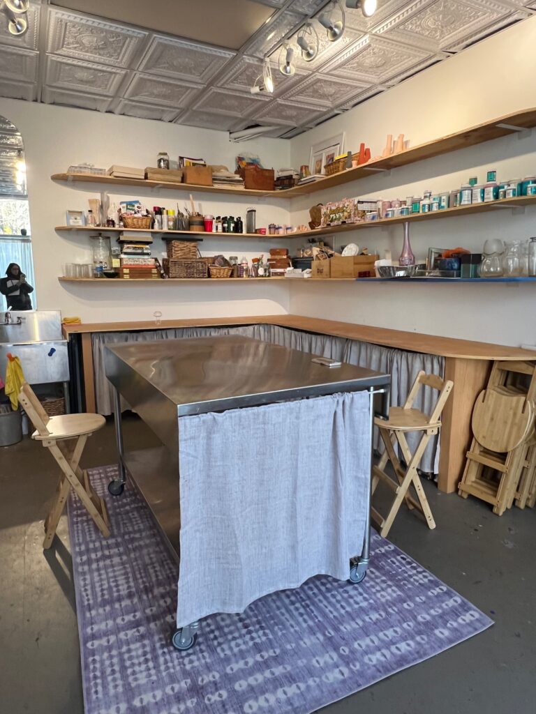 “As part of my memberships, I get space to keep my acrylic paints and a shelf for my vases, keys to come and go, and a place to work. Sometimes [Vivolo and Fink] are here and I get some nice time to interface with them, and sometimes they’re not and I get private studio time,” says Dallos. “If I was bored and couldn’t go to sleep, I could even come in at 2 a.m.!”
