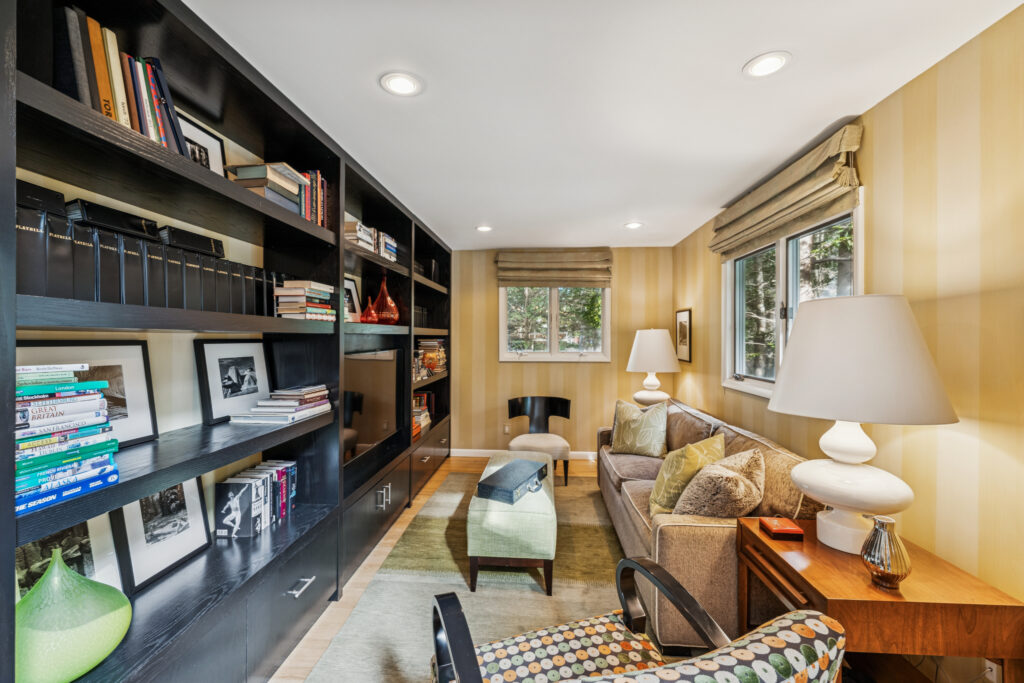The ground level floor is largely dedicated to the 590-square-foot great room anchored by a floor-to-ceiling stone wood-burning fireplace, and the kitchen. There’s a separate sitting room/den with built-in shelving, accessed through the dining area. Three egresses to porches or patios provide easy access to the outdoors, creating a seamless indoor/outdoor flow. An ensuite bedroom on this floor includes access to a private deck. The upper floor is dedicated to two bathrooms of near equal size—about 145 square feet—that share a bathroom. The lower level is finished with an office, a large flexible living/recreation space of 275 square feet, two cedar closets, storage and a utility room. A glass door leads to stairs and Bilco doors that have been fitted with glass to optimize the natural light.