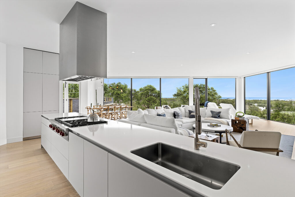 Recently renovated, the Bulthaup-designed kitchen is equipped with a Wolf six-burner range and double oven, Sub-Zero fridge, and Gaggenau dishwasher. The countertops are Butlhaup quartz. The lower level has a fully-equipped catering kitchen with commercial-grade appliances that serves the larger outdoor/cabana entertainment space.