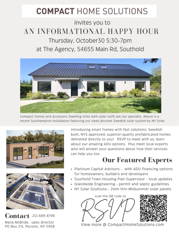 Introducing smart homes with fast solutions: Swedish built, NYS approved, superior-quality prefabricated homes delivered directly to you! RSVP to meet with us, learn about our amazing ADU options. Plus meet local experts who will answer your questions about how their services can help you too.