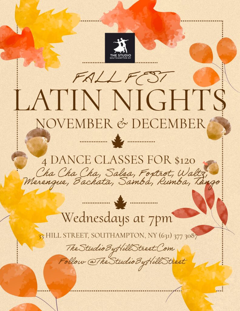 Dreaming of learning Salsa? This is the perfect time, The Studio has launched Wednesdays at 7pm as Open Latin Dance Night. Learn Salsa, Samba and more at this beautiful studio in the heart of Southampton Village. Expert instructors will guide complete beginners every step of the way and also enable advanced dancers to polish their technique. The first class for new clients is free and a Fall Fest promotion offers 4 x classes for $120. The Studio is the Hamptons’ only dance studio offering adult ballroom and Latin dance instruction and is conveniently located in the heart of Southampton Village. Situated within Hill Street Boxing, it offers clients beautiful changing rooms and showers as well as free off street parking.
