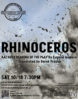 The Playwrights’ Theatre of East Hampton at LTV Studios will present “Rhinoceros” on Saturday, October 18 at 7:30 p.m.