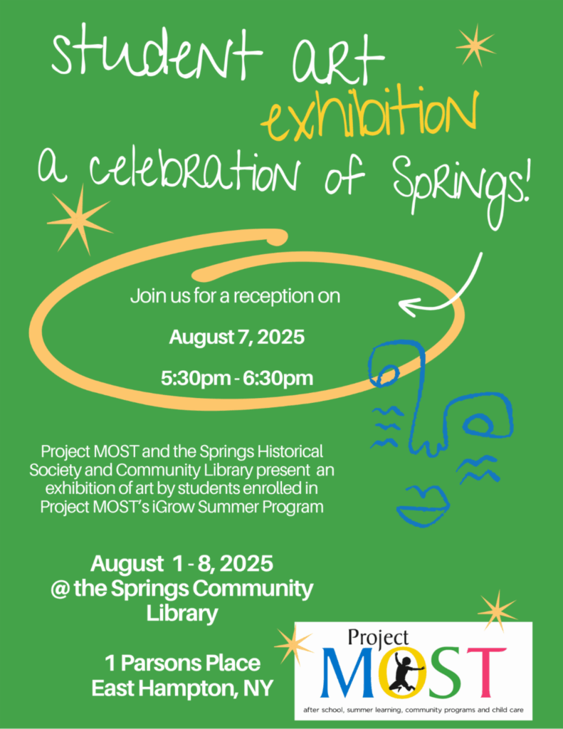 To honor the Springs Historical Society and Community Library’s 50th Anniversary, Project Most will hold an exhibition of student art celebrating springs featuring artwork created by students enrolled in Project Most’s iGrow Summer Program. The artwork will be on display from Friday, August 1 through Tuesday, August 8 at the Springs Community Library and a reception will be held on Thursday, August 7 from 5:30 to 6:30 p.m. The exhibition will include photographs, paintings, and sculptures by students in grades K-8 and the students worked under the direction of artists Linsey Kromer, Karyn Mannix, and Erin O’Connor. This project is made possible in part by support from the Anna Mirabai Lytton Foundation and the New York Community Trust.