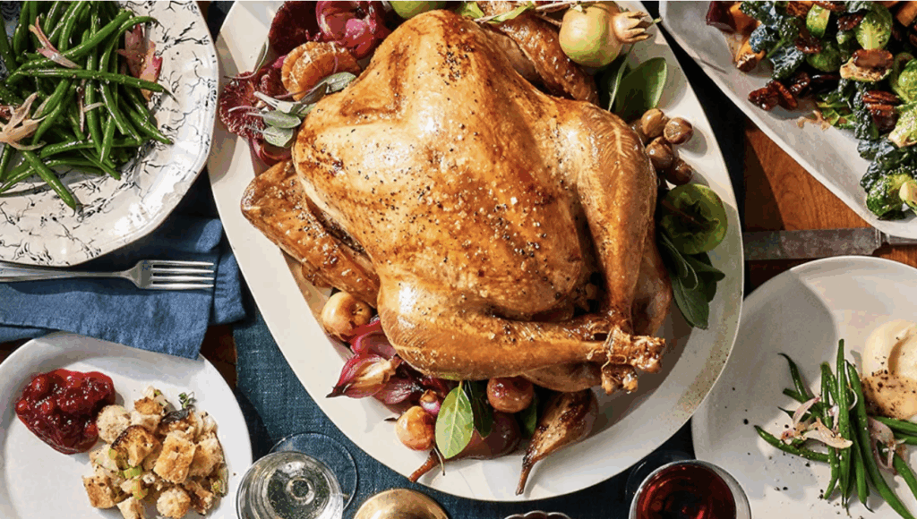Mecox Farms turkey, country herb dressing, mashed potatoes, sweet potato puree, sautéed broccolini, cranberry sauce, gravy and biscuit