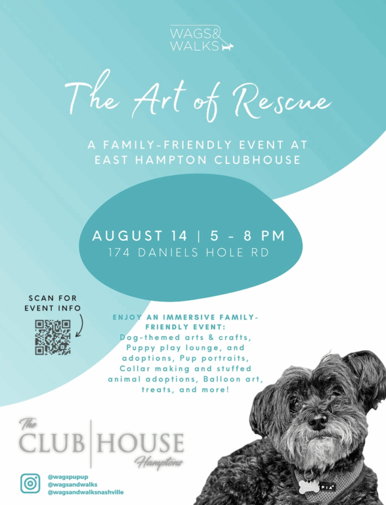 The Clubhouse and Wags & Walks (https://www.wagsandwalks.org) will host The Art of Rescue a family friendly event on Thursday, August 14 from 5 to 8 p.m. The immersive family event will feature dog-themed arts and crafts, a puppy play lounge, adoptions, pup portraits, collar making, stuffed animal adoptions, ballon art, treats and more.